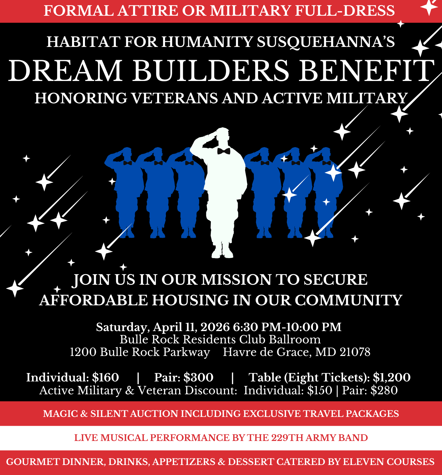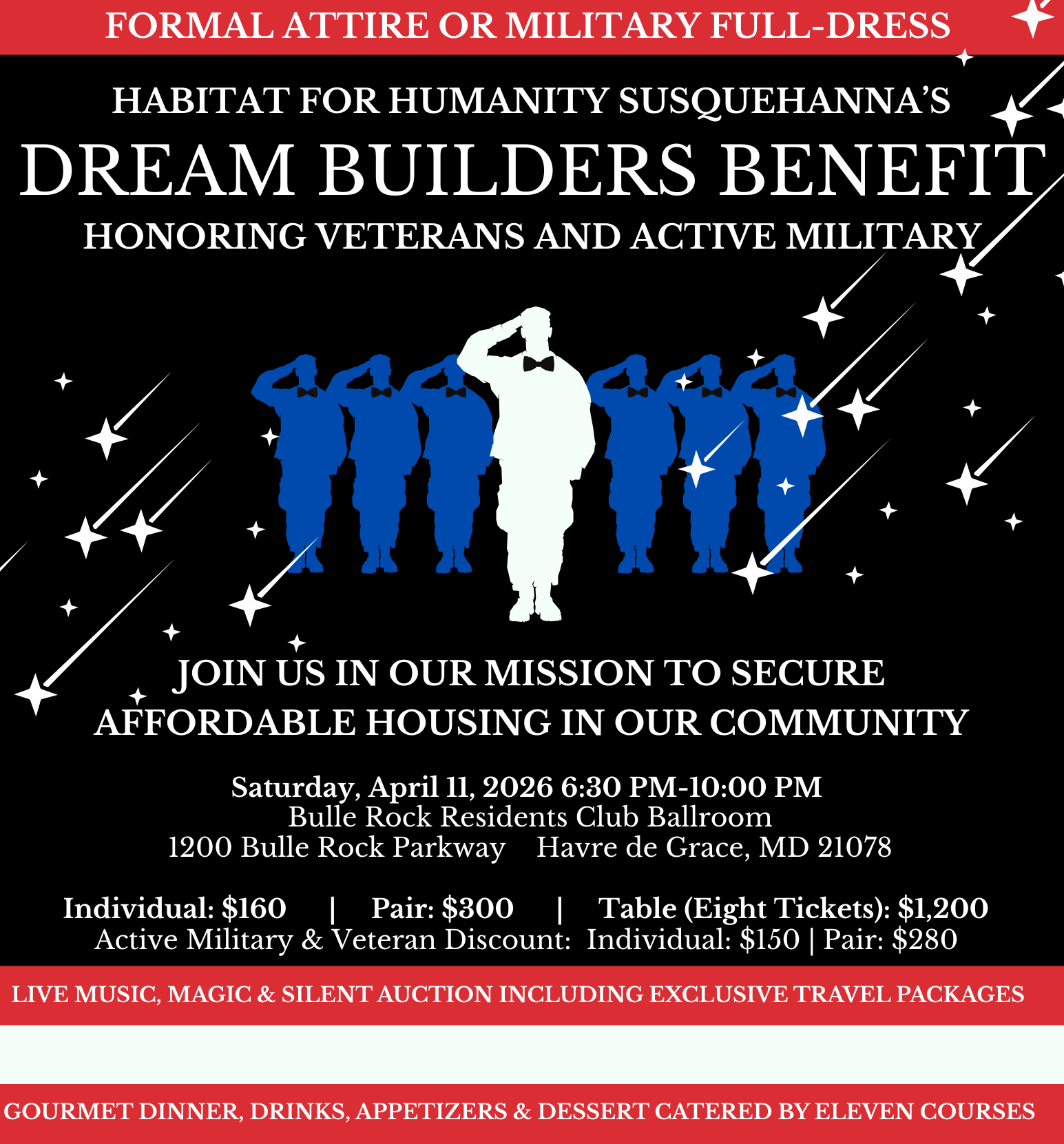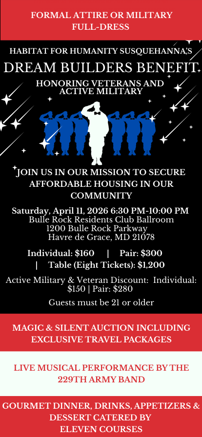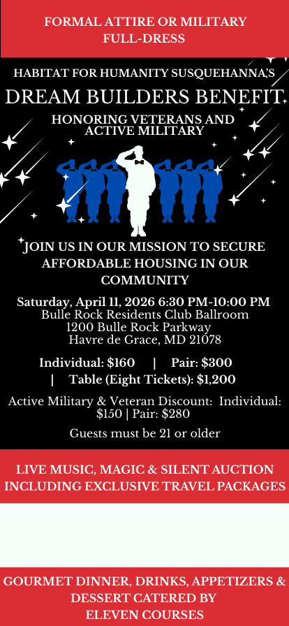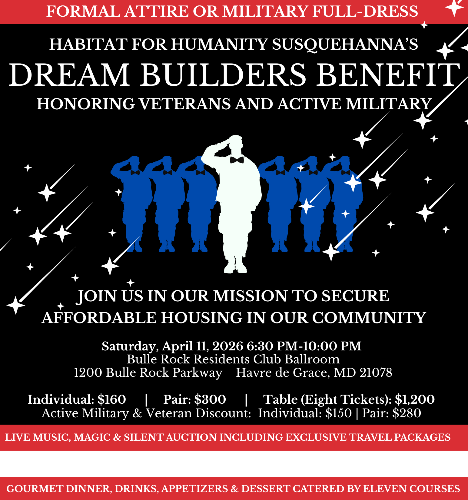 Click Here to Purchase Tickets or Sponsorships OR Click Here to View Sponsorship Levels Please note that all attendees must be 21 years or older. Questions? Or to pay by check or ACH, contact oboswell@habitatsusq.org or 410-638 4434 ext. 7234