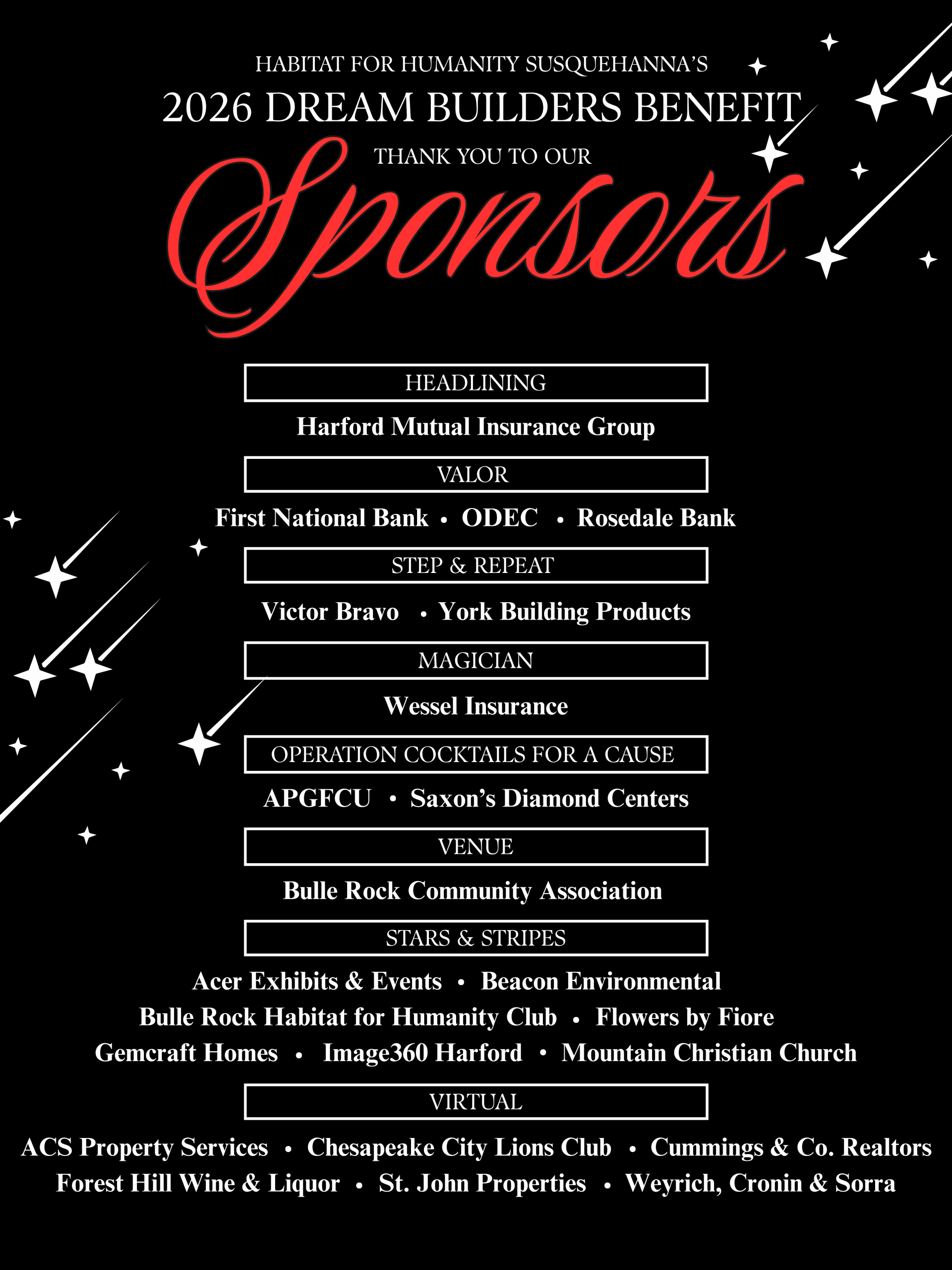 Sponsorships are sold-out for this event. Thank you so much! Click Here to Purchase Tickets OR Click Here to View Sponsorship Levels Please note that all attendees must be 21 years or older. Questions? Or to pay by check or ACH, contact oboswell@habitatsusq.org or 410-638 4434 ext. 7234